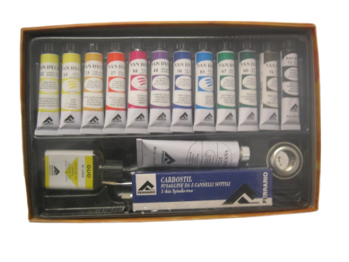 L'ensemble contient 12 tubes Van Dyck 20 ml,1 tube de 60 ml, 1 huile de lin, 2 pinceaux, une godet en métal, 5 fussin et une palette en bois.