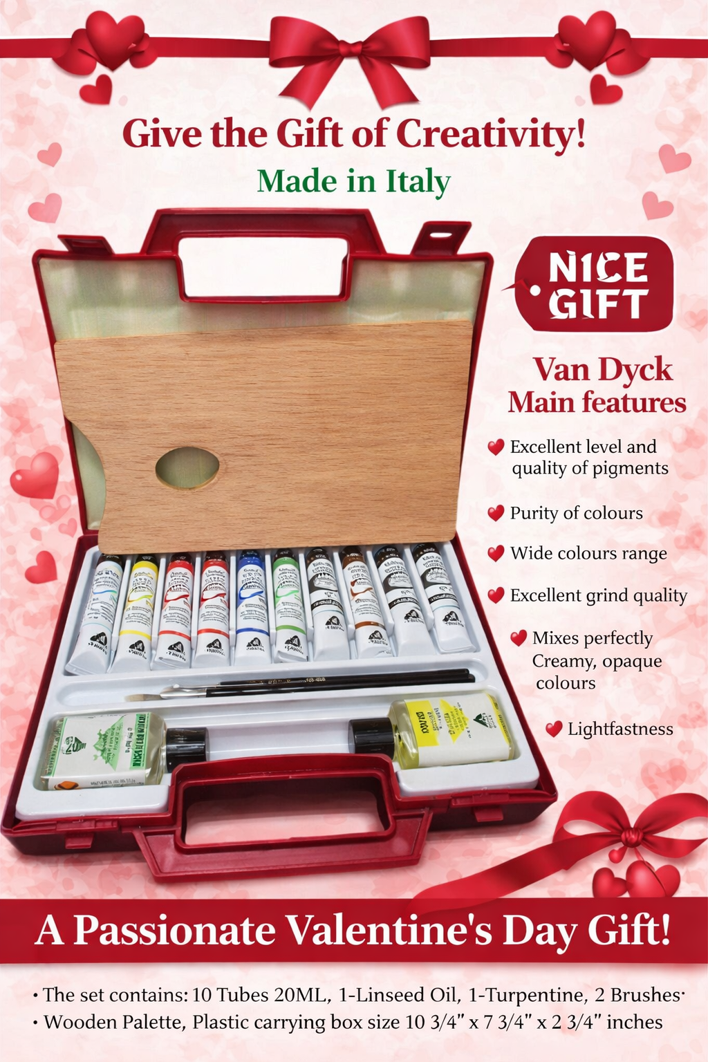 L'ensemble contient 10 tubes de 20 ml, 1 huile de lin, 1 térébenthine, 2 pinceaux, une palette en bois, un boite en plastique de 10 3/4'' x 7 3/4'' x 2 3/4'' pouces.