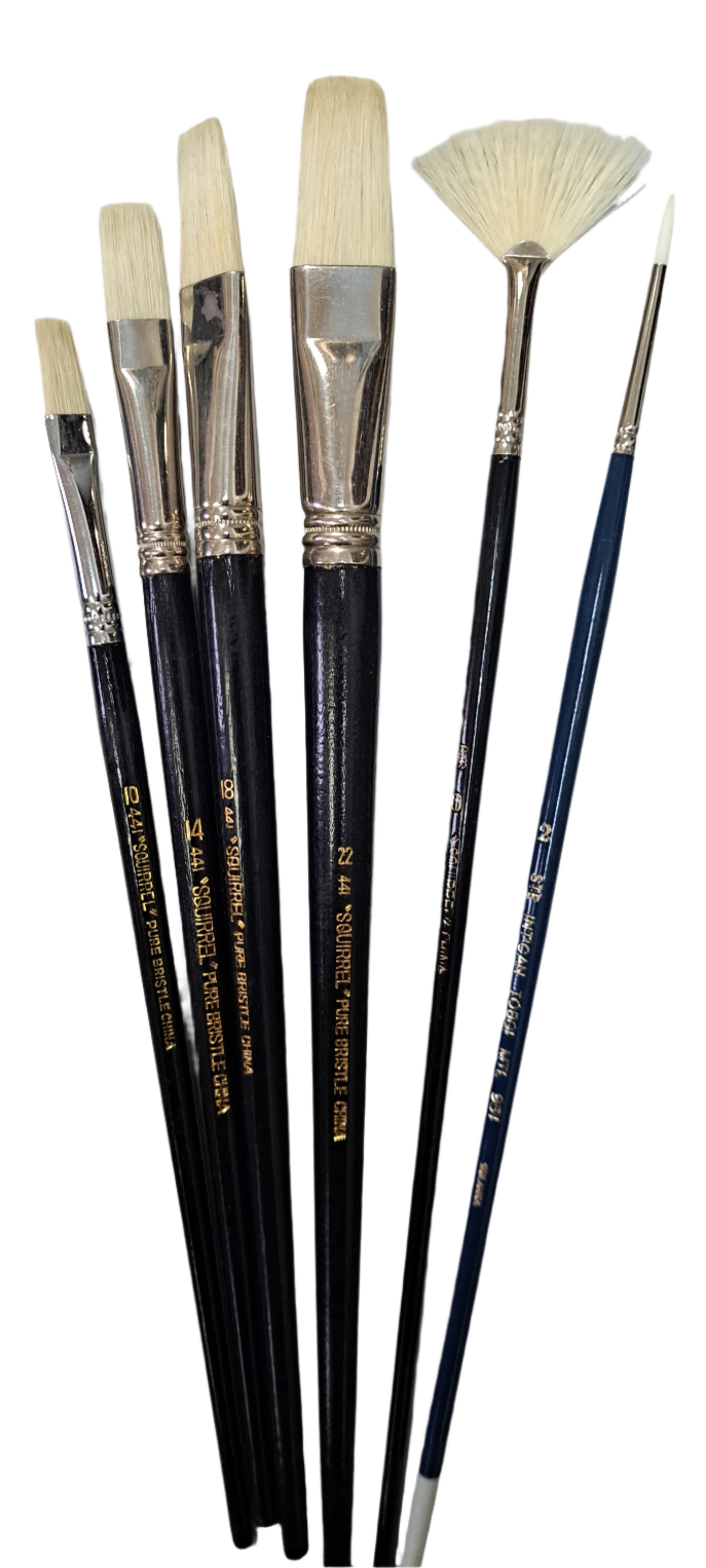 Cet ensemble comprend une variété de pinceaux plats de tailles assorties (série 441 n° 10, 14, 18 et 22), en soies blanches, adaptés à la peinture à l'huile et à l'acrylique. Un pinceau éventail n° 6 en soies blanches et un pinceau rond en soies synthétiques n° 2 sont également inclus.